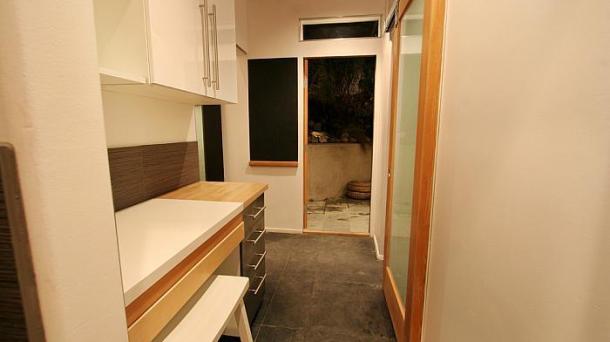 This apartment with nice shades of blue and a beautiful bathroom will help you to relax after work.